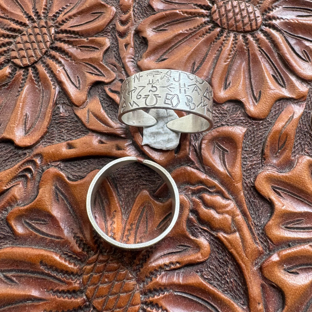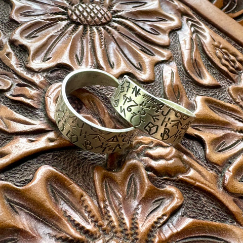 This rings are made out of sturdy and heavy 18g sterling silver. They feature an array of engraved livestock brands and are adjustable. These rings are sizes 11-13 and 10-12.