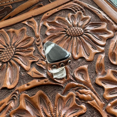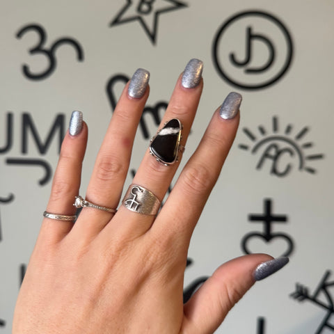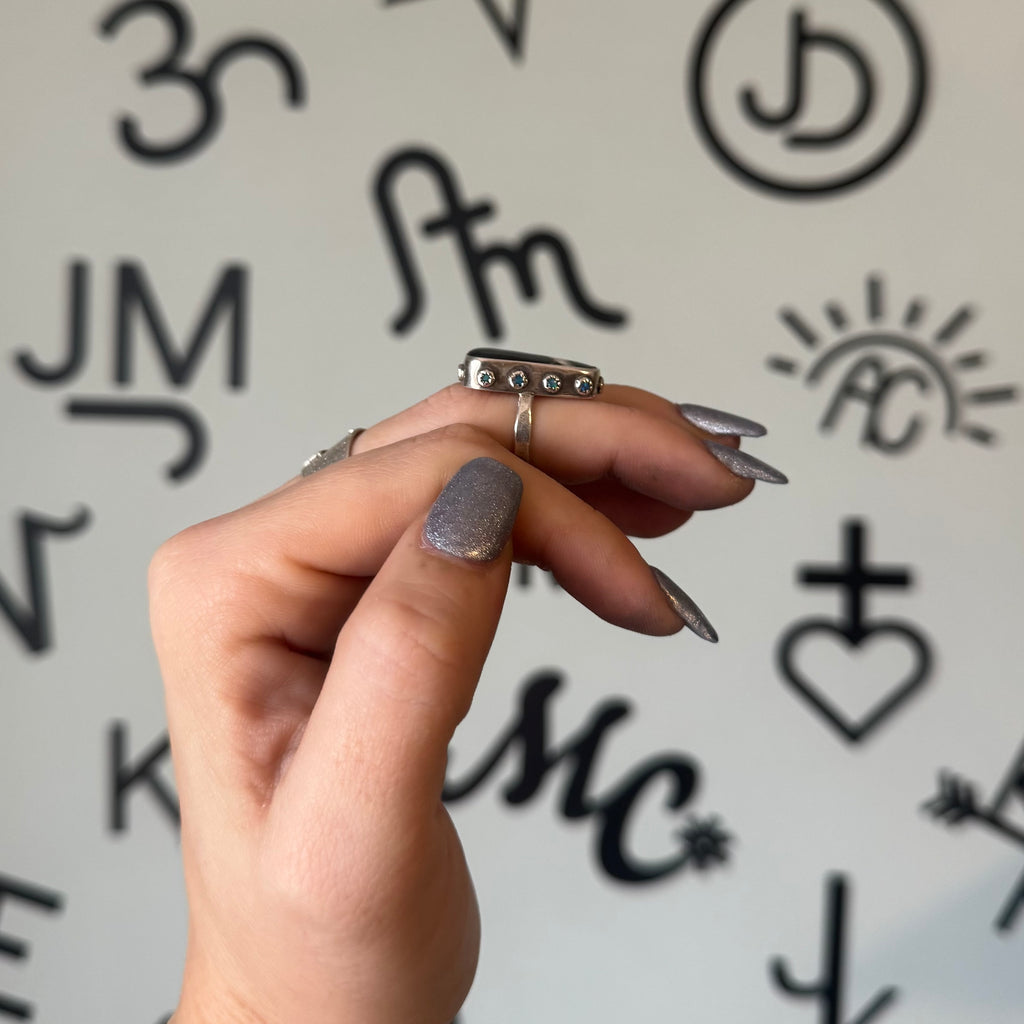 This ring was an absolute labor of love and I’m letting it go for a steal. Not only does it feature an extremely unique White Buffalo stone, the fine silver bezel holding the stone features 11 tiny blue Australian Opals. You won’t find another ring like this. It’s finished to a size 6.5.