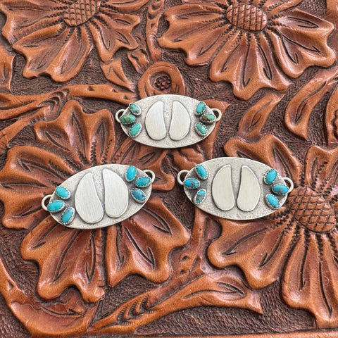 These cute necklaces feature little hand-sawn cow hoof prints set on a sterling silver backplate with 6 genuine turquoise stones.