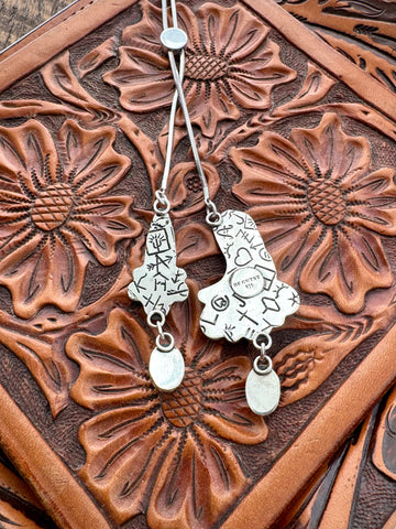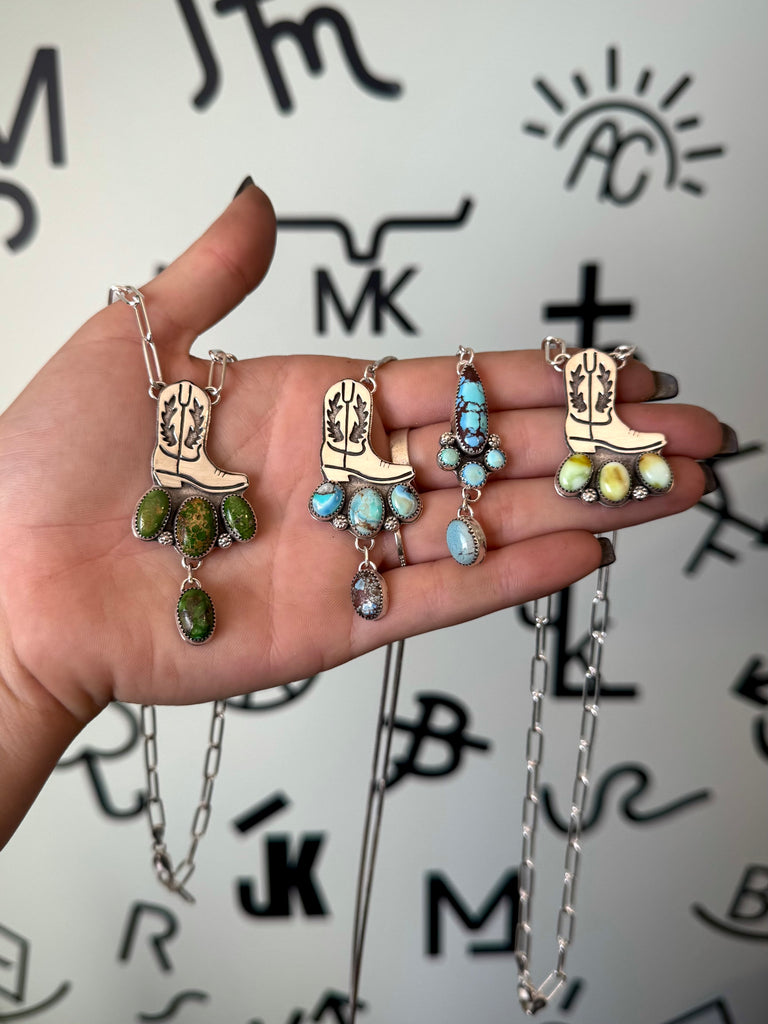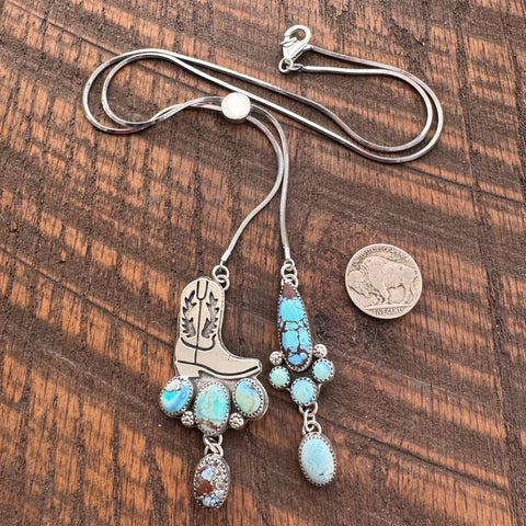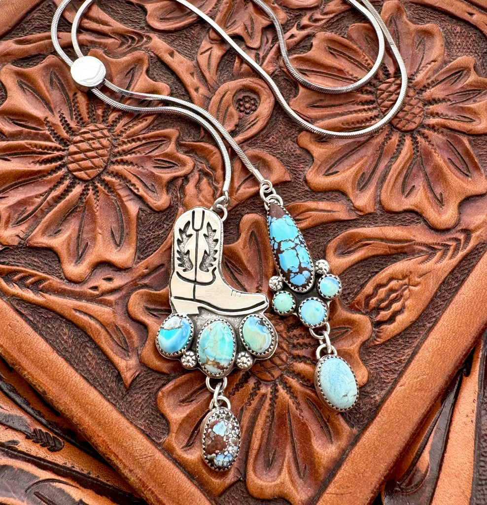 This special superior quality lariat chain was the perfect fit for the cutest cowboy boot pendant and cluster. The cowboy boot is hand-sawn from sterling silver and mounted on a sterling backplate which also features 3 Golden Hills turquoise stones and silver flower accents. The boot boasts a dreamy Golden Hills drop charm.