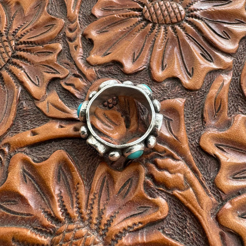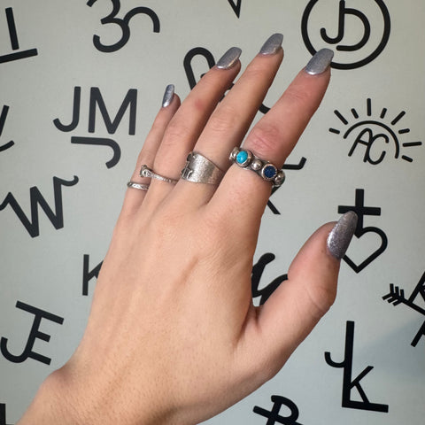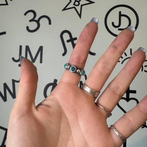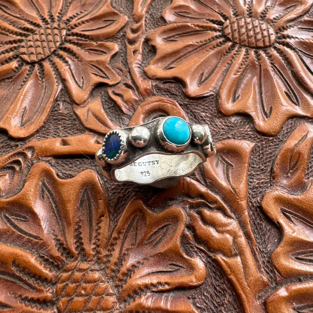 It’s an infinity ring, which means it alternates Kingman turquoise stones with the highly sought after blue Australian Opal around the entire band. It features silver accents between each stone and sits at a size 7 3/4. It’s a wide band, so this chunky ring would best fit someone around a size 7!