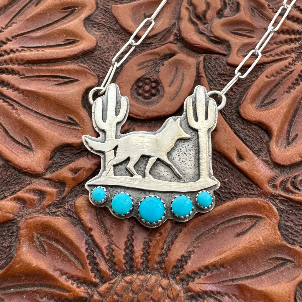 This fun necklace is crafted entirely of sterling silver and features an intricately hand-sawn scene of a coyote among two cactus. Below the silhouette is 5 Sleeping Beauty turquoise stones each set in fine silver. The necklace is hung from a 16 inch sterling silver paperclip chain.