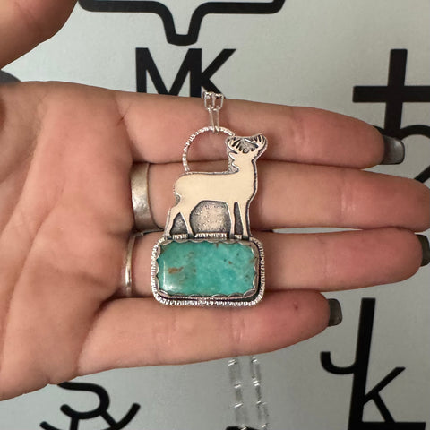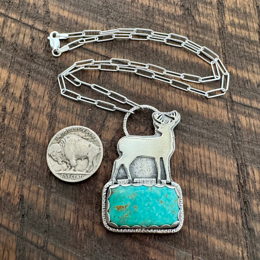 This pretty necklace is crafted entirely of sterling silver and features a hand-sawn silhouette of a buck. Below the deer sits a stunning Kingman turquoise stone set in fine silver and surrounded with a silver sparkle wire border. The necklace is hung from a 16 inch sterling silver paperclip chain.