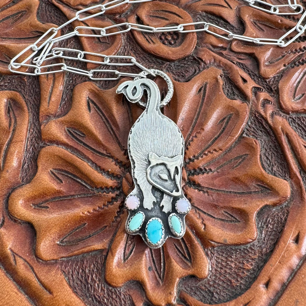 This one-of-a-kind necklace features three layers of sterling silver. The top layer features an intricately hand-sawn adorable little opossum face. The second layer features Dave's body which includes detailed hand-etching to give him that furry-feel. The third layer is the backplate also featuring 5 stones including: Pink Conch, Sleeping Beauty, and Carico Lake turquoise. This fun necklace is hung from a 16 inch sterling silver paperclip chain.