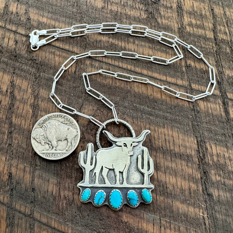 This one-of-a-kind necklace features two layers of sterling silver. The top layer features an intricately hand-sawn longhorn among the cactus. He sits above 5 stunning Sleeping Beauty turquoise stones. This fun necklace is hung from a 16 inch sterling silver paperclip chain.