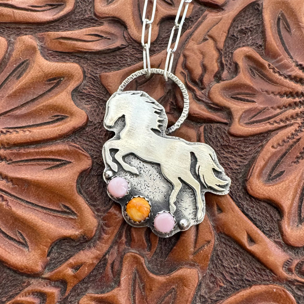 This pretty necklace is crafted entirely of sterling silver and features a hand-sawn silhouette of a rearing horse. Below the horse sits 3 stones including Orange Spiny Oyster and Pink Conch each set in fine silver. It also features two fine silver ball accents. The necklace is hung from a 16 inch sterling silver paperclip chain.
