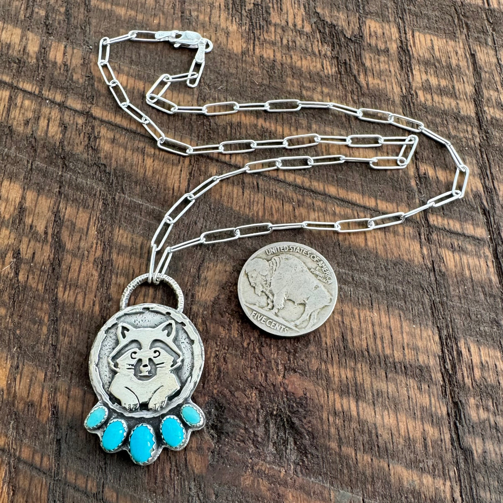 This one-of-a-kind necklace features three layers of sterling silver. The top layer features an intricately hand-sawn, adorable raccoon. The middle layer features a hand-sawn hollow log. The third layer houses the top 2 as well as 5 genuine Sleeping Beauty and Carico Lake stones. This fun necklace is hung from a 16 inch sterling silver paperclip chain.