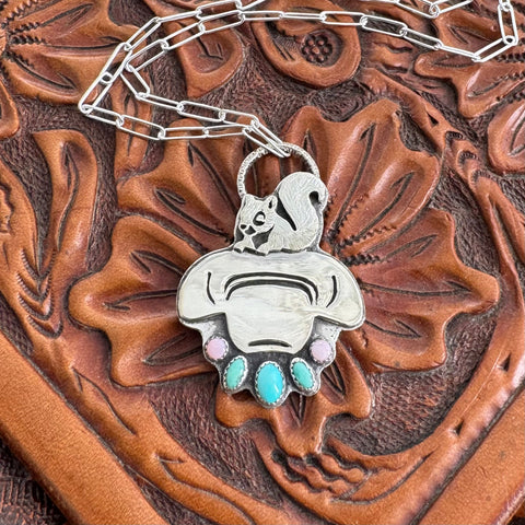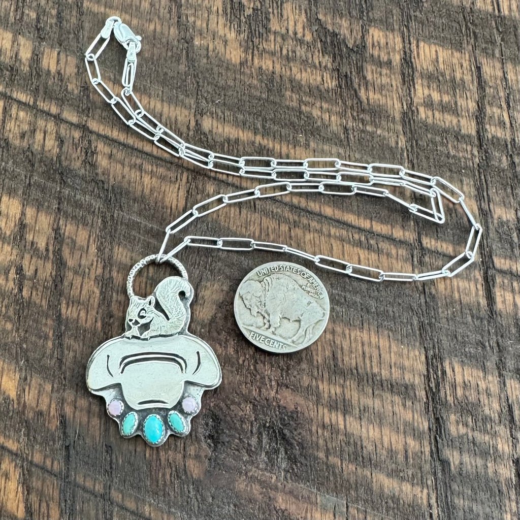 This fun necklace features 3 total layers of sterling silver. The top layer features the cutest little hand-sawn squirrel that also features hand-etching to give him that truly furry look. The second layer features an intricately hand-sawn cowboy hat. The third layer houses the top two as well as 5 stones including Pink Conch, and 3 Carico Lake turquoise stones. He's hung from a 16 inch sterling silver paperclip chain.