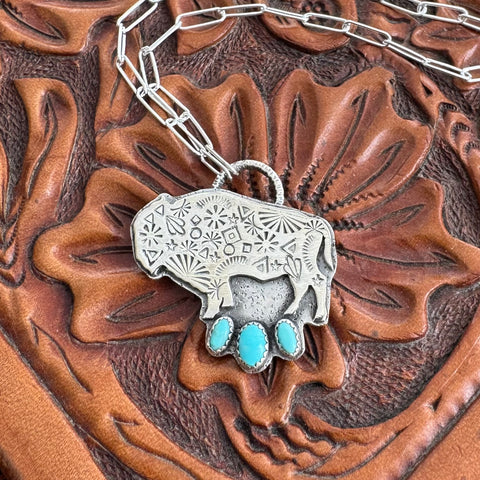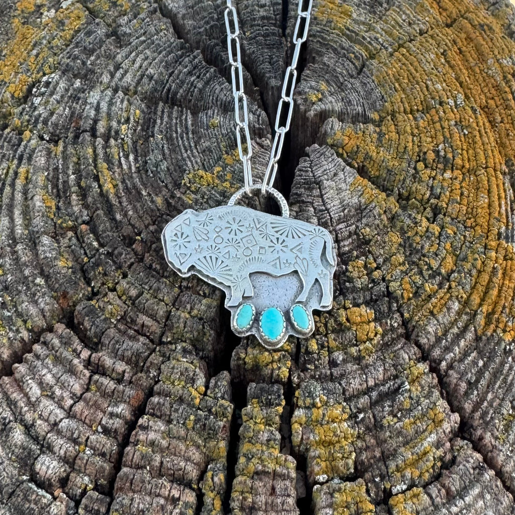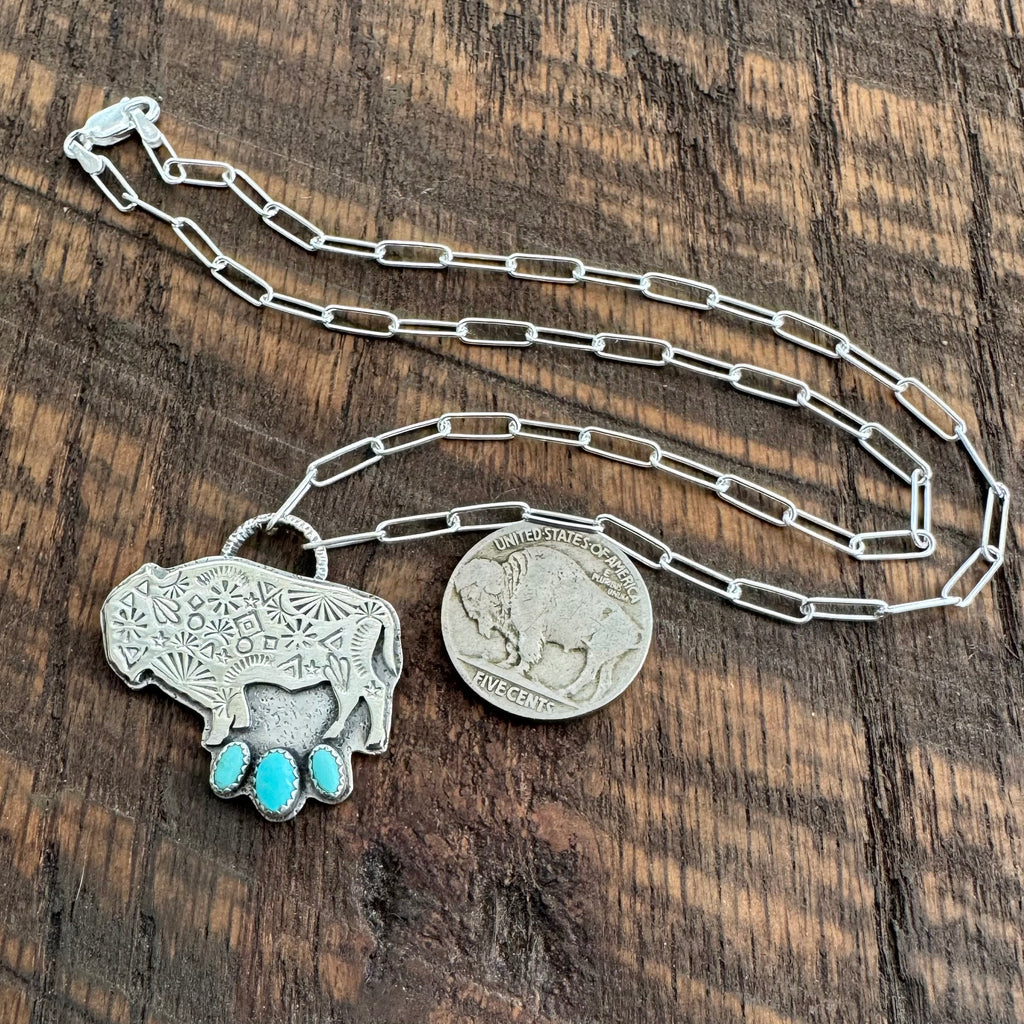 This cute necklace features a hand-sawn sterling silver buffalo. The buffalo features an array of hand-stamping and is mounted on a sterling silver backplate. He features 3 Carico Lake turquoise stones and is hung from a 16 inch sterling silver paperclip chain.
