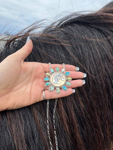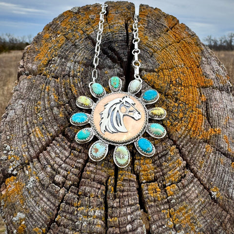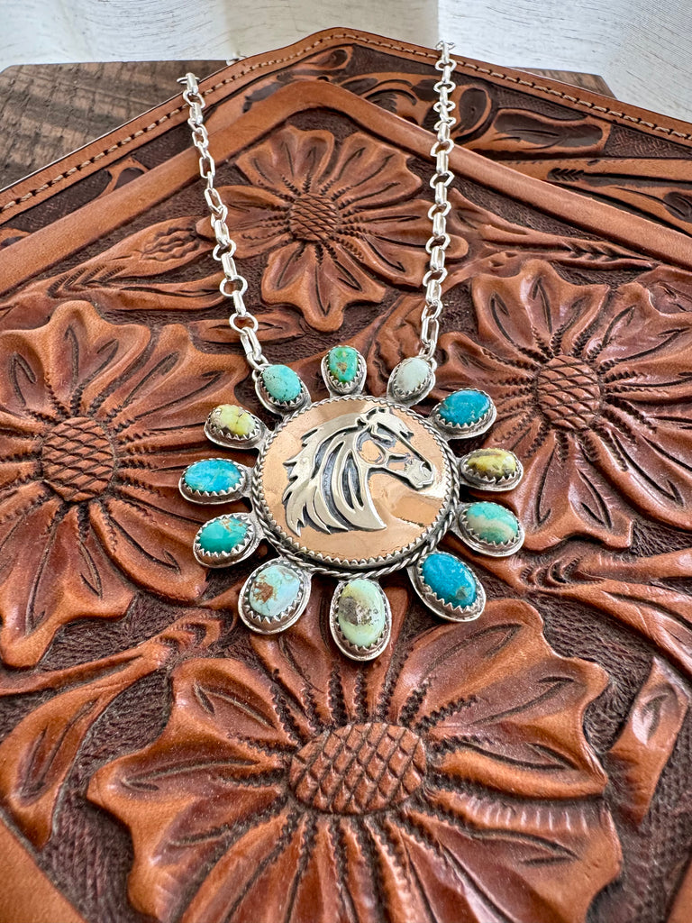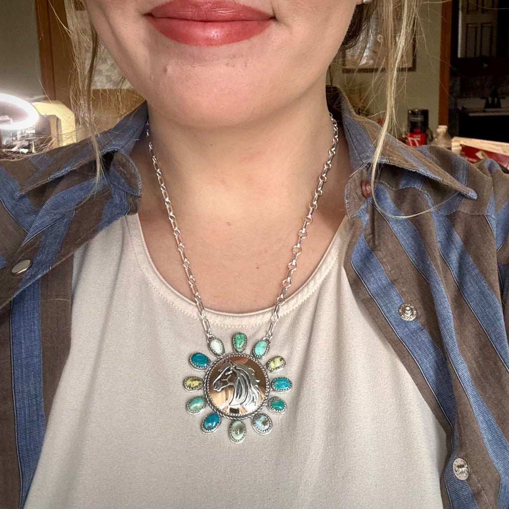 Carefully crafted, this necklace features nine genuine turquoise stones and three Palomino variscite stones, each wrapped in fine silver bezel and set on a heavy sterling silver backplate. At the center of the pendant sits a bronze stone, slow-crafted with a hand-sawn sterling silver horse mounted on a round bronze backplate finished to a high shine. The bronze centerpiece is framed by a sterling silver rope border, adding depth and texture.