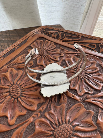 The cuff is constructed with a split design using two heavy square sterling silver patterned wires, finished with subtle copper-wrapped ends for comfort. Measuring 6.5 inches, it best fits a medium wrist and can be adjusted slightly smaller or larger.