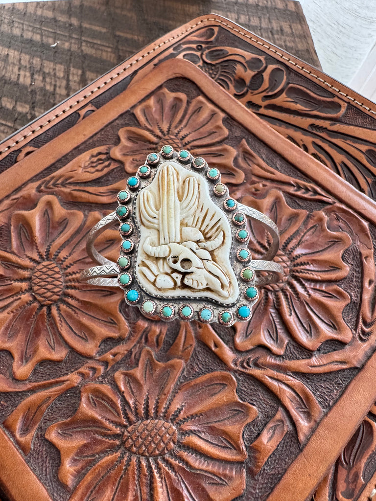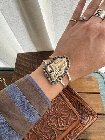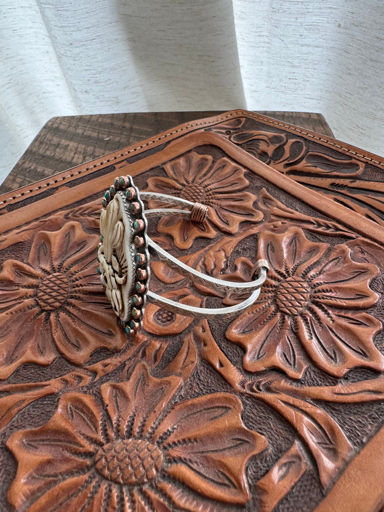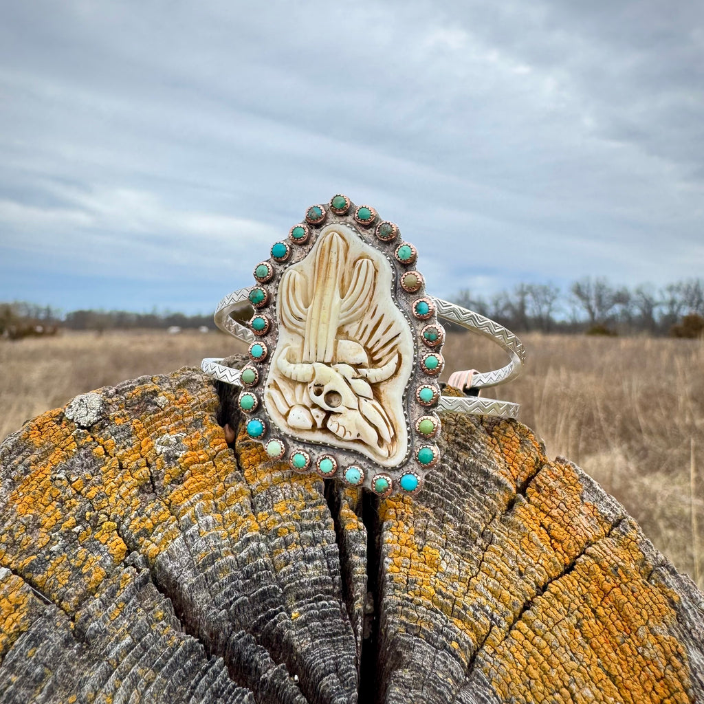 This statement cuff was slowly and carefully executed. At its center sits a one-of-a-kind hand-carved cow bone, wrapped in a fine silver bezel. Surrounding the centerpiece are twenty-seven genuine turquoise stones set in copper bezels, each varying in tone and character and featuring Carico Lake, Kingman, and Sleeping Beauty turquoise.