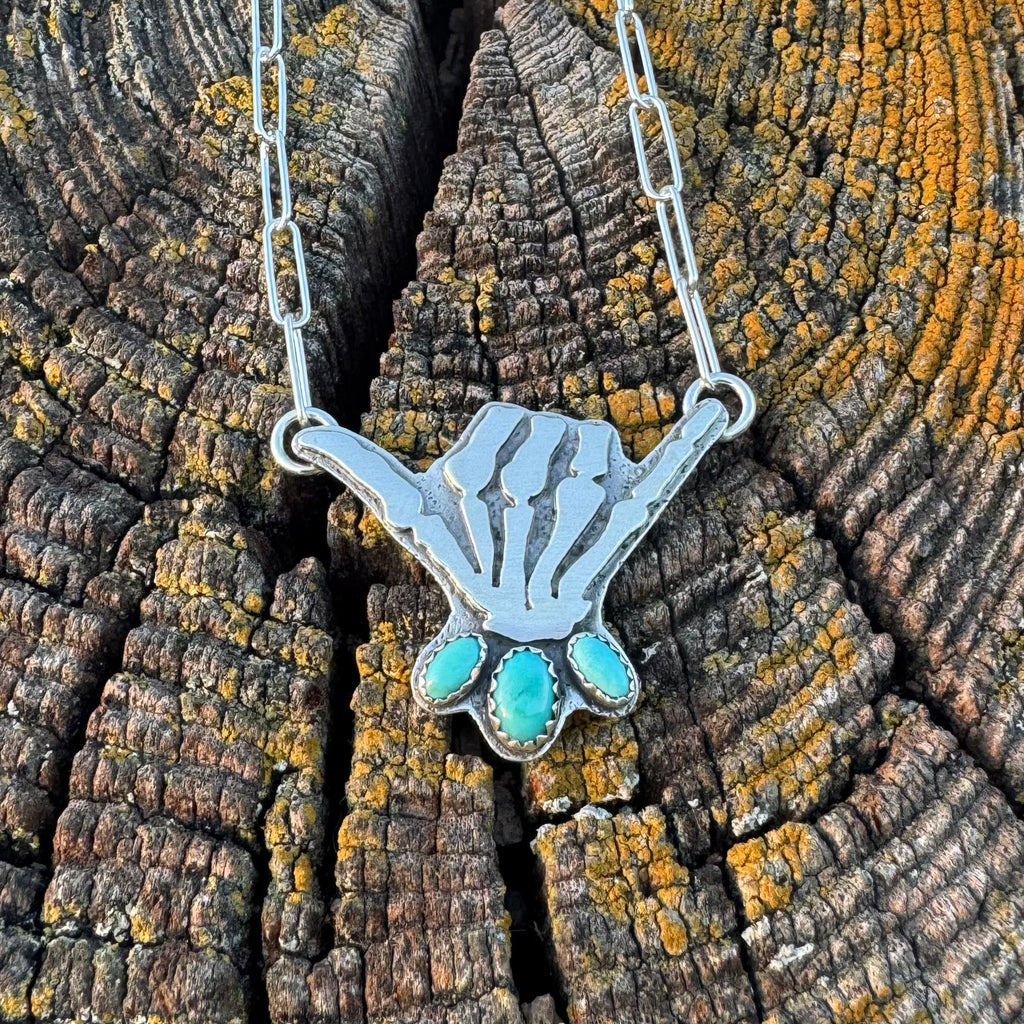 This skelly hand is hand-sawn from sterling silver and is considered a "medium" size at 1 inch from finger to finger. It features 3 Carico Lake turquoise stones in a light blue. It's hung from a 16 inch sterling silver paperclip style chain.