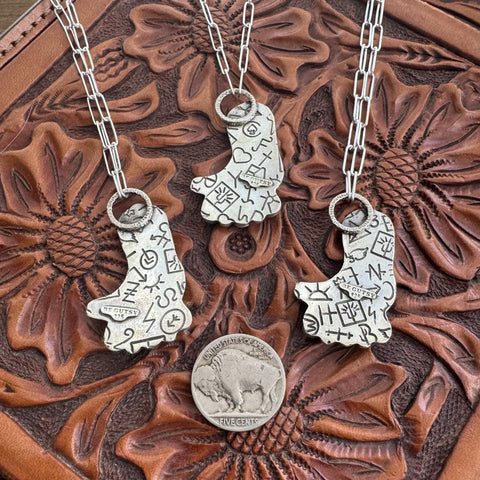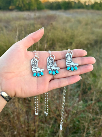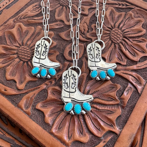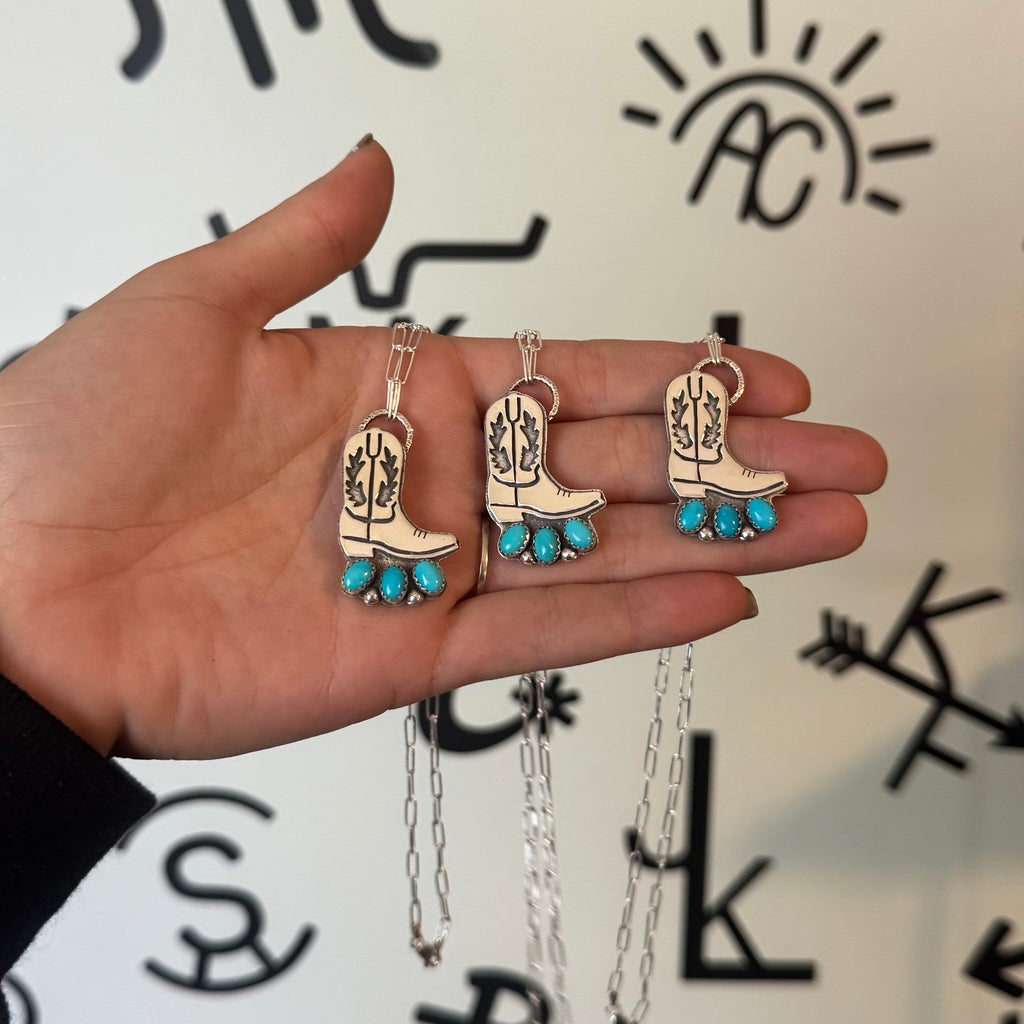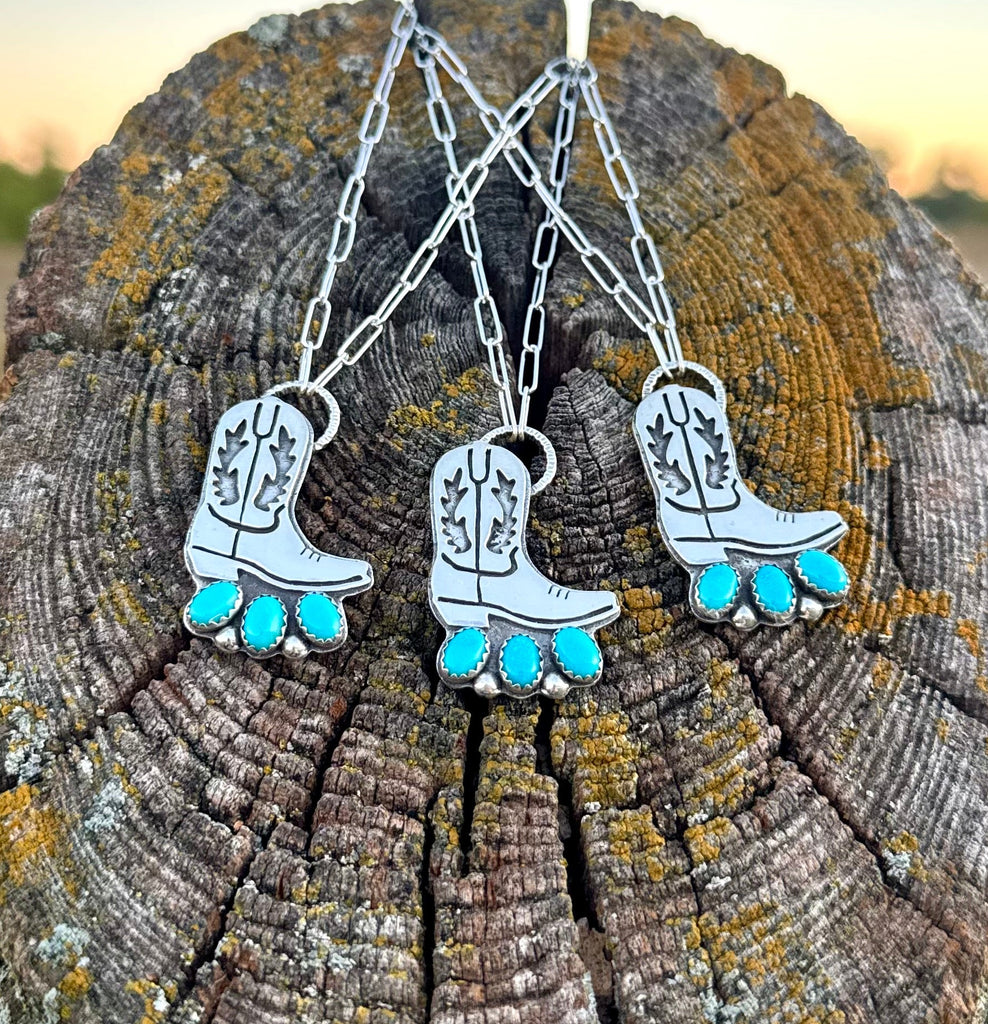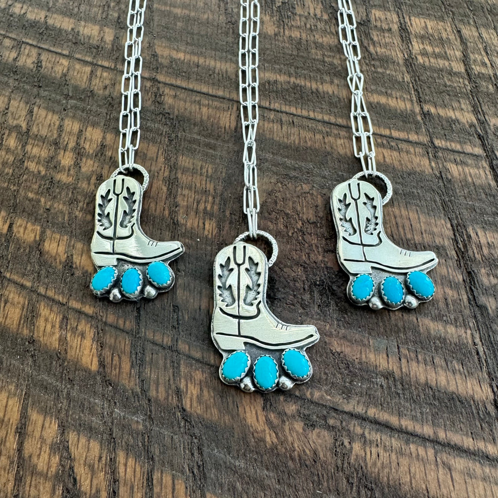 These little cuties are the perfect stackers for your daily set! Each features an intricately sawn cowboy boot from sterling silver. The boot is mounted on a sterling backplate that also features all the cutest little western brands! They’re finished to a high polish and each necklace features 3 Sleeping Beauty turquoise stones with sterling silver accents.