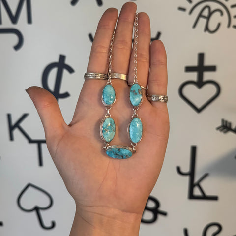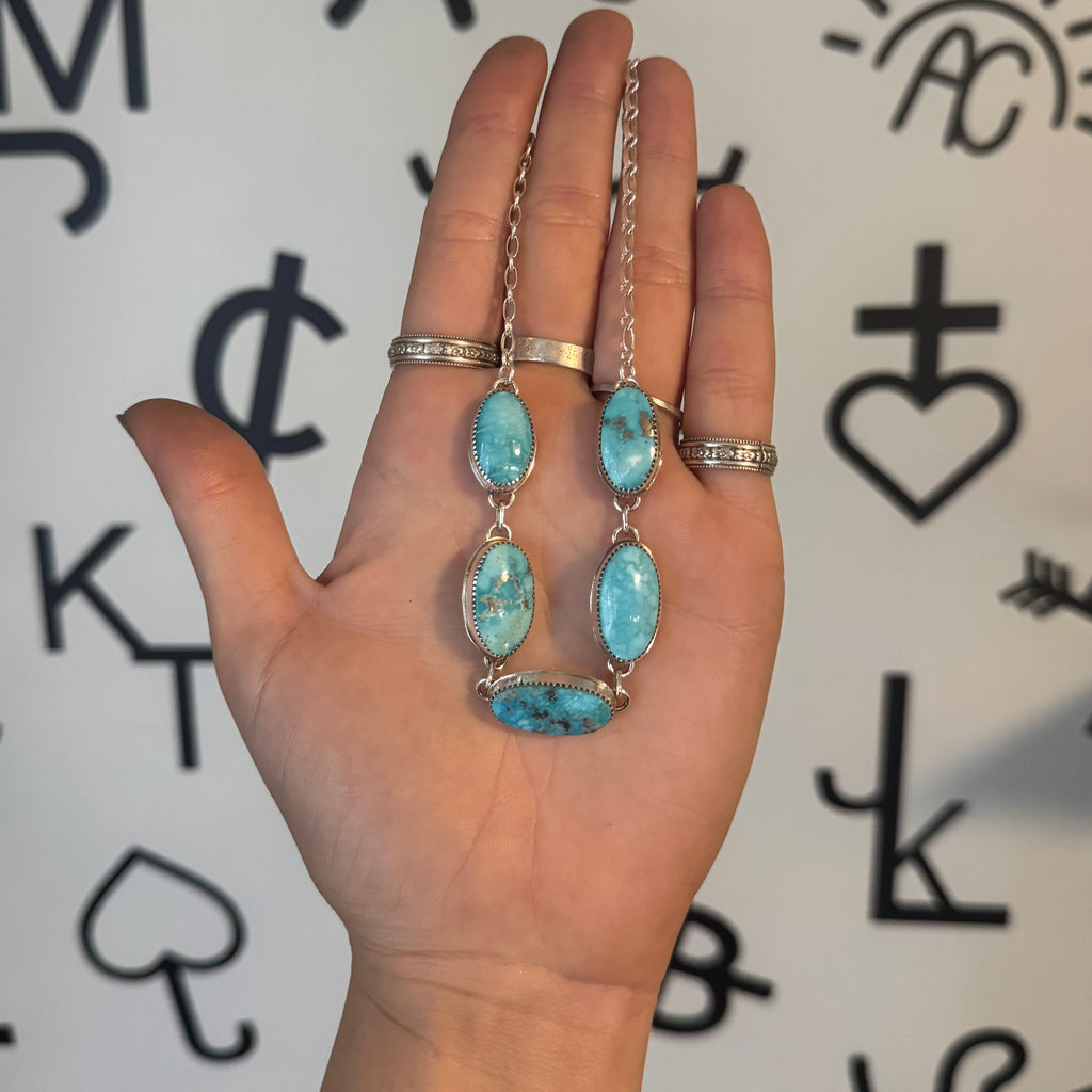This stunning necklace features 5 good-sized genuine White Water stones. Each stone features the dreamy white matrix, the flakes of pyrite, and the truest blue color I’ve ever seen in person. Each stone is expertly set in fine silver on a sterling silver backplate. This five stone choker sit at 16 inches in total length with a 2 inch adjuster to wear as short or long as you’d like. The chain and clasp are sterling silver.